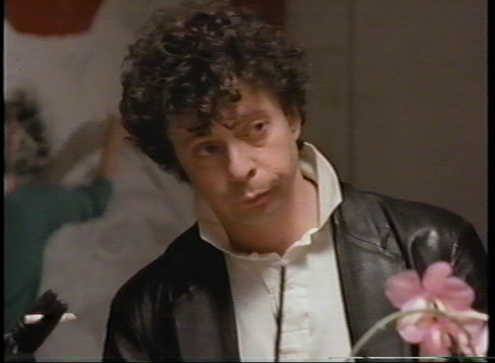 The film, which runs about a half hour long, weaves together a few tenuously related vignettes set in New York’s downtown art scene: There’s a hot-headed artist concerned with paying his bills (Liotta), a manic nightclub monologist ranting about consumerism (actual monologist Eric Bogosian, also credited as having co-written the screenplay and apparently doing his own act), a late-night car radio theft, and some snarky chatter in the ladies’ room of a fancy restaurant. Wandering through most of these scenes and (sort of) tying them together are a spacy young man credited as “The Watcher” (Stipe) and an equally wide-eyed innocent referred to accurately as “Woman in Black Suit” (Jessica Cardinale; that’s her on the front cover of the cassette).